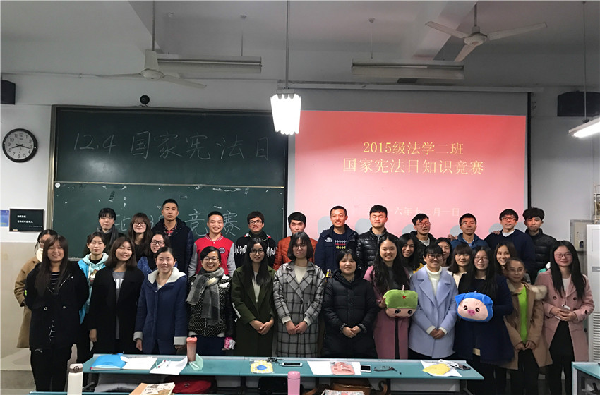12月1日晚上,2015级法学二班在行知楼2020103教室,成功开展了宪法知识竞赛。本次宪法知识竞赛由2015级法学二班团支部组织,各团小组派三人代表本小组参赛。