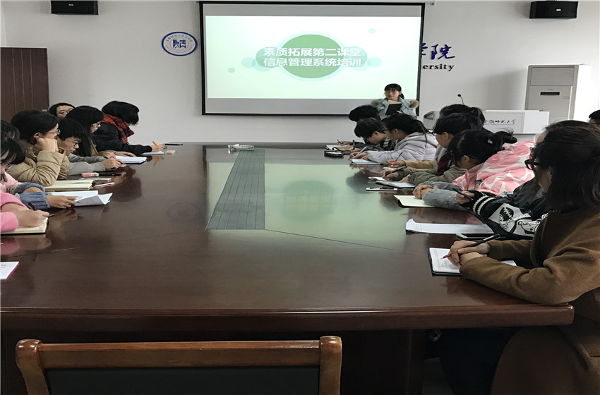 11月23日下午一点,bet36365路检测中心团委素拓部在bet36365路检测中心行政楼四楼会议室召开了第二课堂信息管理系统培训会,出席本次会议的有院团委学生副书记左丽丽、学生会主席马丹宁、三大社团会长王玉峰、周世解、邱浩以及社团班级的学分认证负责人员,会议由素拓部部长胡佳主持。