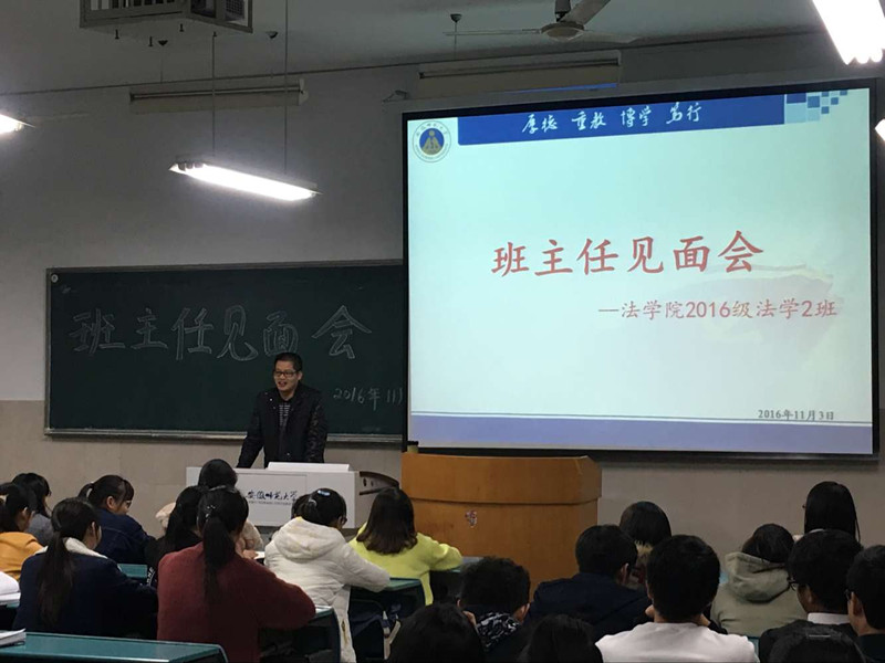 11月3日晚七点,16级法学2班班主任见面会在2020504教室召开,法学二班班主任高永周老师以及法学2班的全体同学参加了此次见面会。会议由辅导员储梦凡主持。