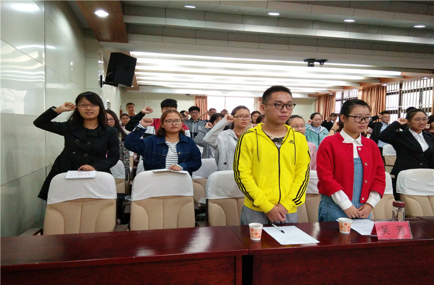 会议在主持人的介绍中拉开了序幕。大会第一项,全体起立奏唱国歌。紧接着,会管中心副部长黄畅代表职研会欢迎各位新理事的加入并对部门的工作提出了几点要求。随后,四位新理事成员代表依次发言,从各方面阐述了自己对在职研会工作的理解以及期待,都表示愿为职研贡献自己的一份力量。社管部部长吴芳向大家介绍了有关职研的发展历程及相关活动,以及与社管部之间的工作联系。接下来,周世解会长宣读留任名单,同时,他强调大家要端正态度,要以积极的态度去完成各项工作,更诙谐生动地用自身经历来教育大家要敢于尝试,敢于挑战。会议的最后,网技部副部长宋杰带领大家宣誓入职。