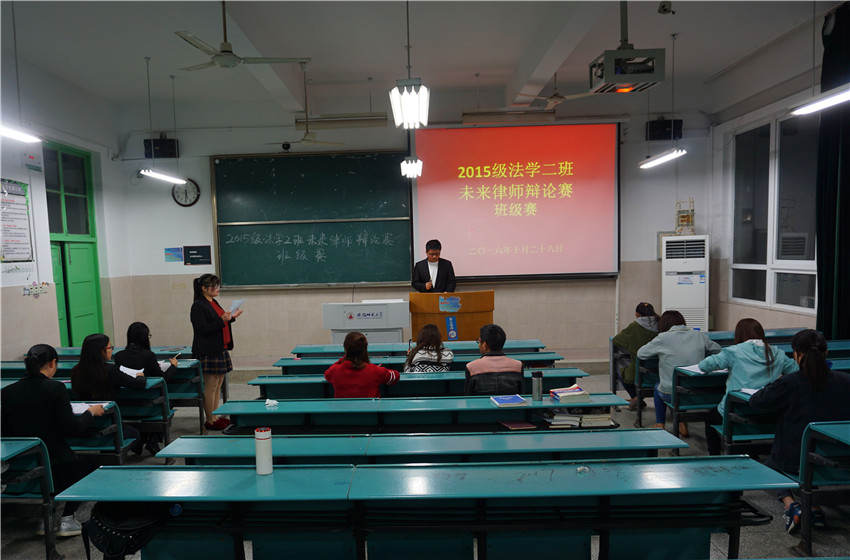 10月28日晚上,2015级法学二班在行知楼2020103教室成功进行了“未来律师”辩论赛班级比赛。本次辩论赛共有9支队伍参加,由班委担任评委。