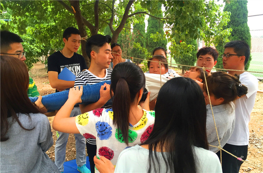 早上8:00全班所有同学齐聚南体篮球场,等待活动开始。随着一声哨响,在2014级休闲体育专业的学长命令下,全班同学们迅速围成一个大圆圈。所有同学报数,随机分成6组,每组一个2014级休闲体育专业学长,负责活动全程指导。分组完成后,各小组成员马上进行小组建设,商量队名、队歌、口号,绘制队旗。不一会儿,6个小组便完成了小组创建工作,并向所有同学进行了小组风采展示。从“TO BE NO.1”队,到“大顺队”,每个队都有各自独特的名字口号,队员们真是奇思异想,脑洞大开。风采展示完毕后,各个小组前往指定场地,进行相关的活动。在活动场地,各队都要做两个游戏“反转魔毯”、“穿越电网”。在游戏中,同学们充分开动智慧,团结协作,分工配合,边实践边调整方法,最终所有团队都完成了游戏。