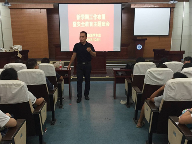 8月28日下午3点,2013级法学专业在教学法庭召开新学期班级工作布置暨安全教育主题班会,班会由辅导员陈兴宇老师主持,班级158名同学悉数参加。
