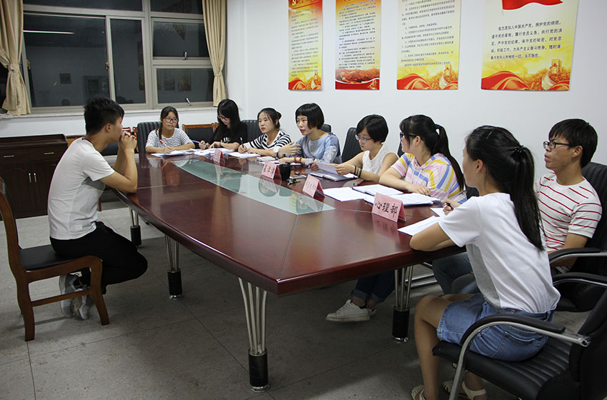 9月8日晚7点,参与团委学生会招新第三轮面试的新生们准时到达了bet36365路检测中心行政楼的面试点。院团委书记王虹圆、院团委副书记陈兴宇、辅导员瞿津津、王琳、桂彬和储梦凡以及团委学生副书记左丽丽、学生会主席团马丹宁、付玉婷、纪思雨、许陈与各部门部长们出席了此次面试。
