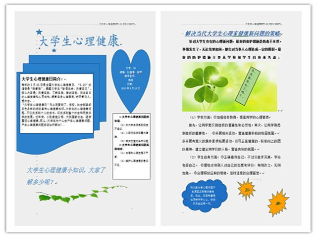 为进一步提高大学生的心理素质,宣传普及心理健康知识,深入开展心理健康教育,15法学2班在积极组织和参与学院5.25心理健康活动月的有关活动的同时,还结合学院安排在5月份也开展了利用班刊普及心理健康知识的教育活动。