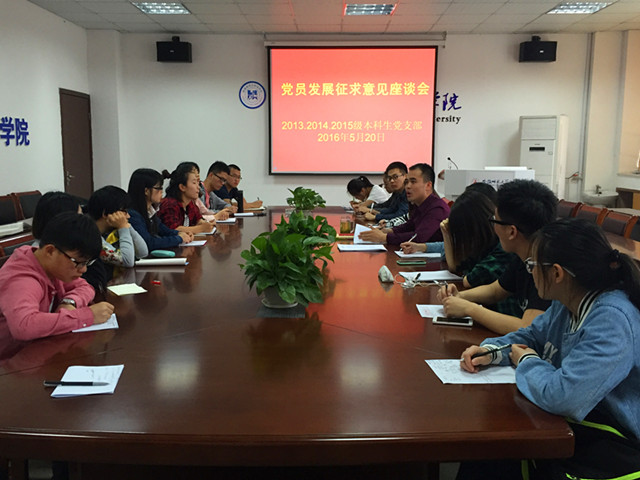 5月20日下午2点,2013级法学专业一班、二班在行政楼四楼会议室召开了党员发展征求意见座谈会。院团委副书记兼2013级法学专业辅导员陈兴宇、两个班级全体预备党员、班级干部代表、入党积极分子代表、普通学生代表参与此次座谈会。会议由陈兴宇主持。
