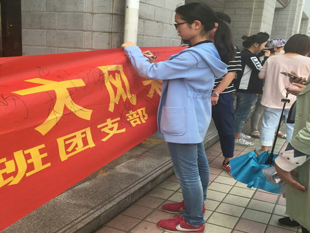 经过班委们事先的精心策划,积极动员,同学们放学后都早早来到一号食堂门口参加横幅签名活动。同学们郑重的在赫然印有“谱青春华章,展师大风采”的班级横幅上,签下自己的名字。一笔一划是作为新时代青年的我们的铿锵宣言,一言一行是身为bet36365路检测中心学子的责任担当。