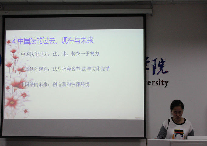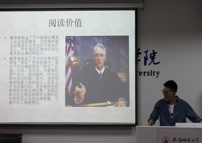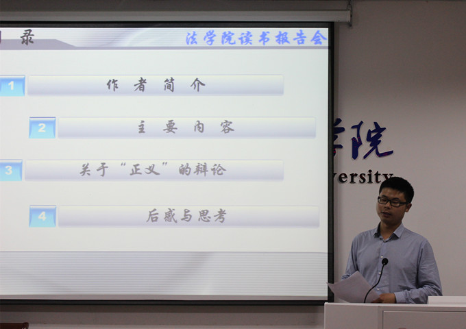 首先,由主持人介绍了评分细则。第一位汇报的是金超同学,他分享的书籍有关权利从哪里来,从作者、内容等方面着手展开讨论,分析了权利的来源和背景以及他的读书感悟。第二位汇报的是王伟同学,他就《理想国》这本书表达了自己的观点,他通过介绍什么谓之于正义,如何实现正义等方面进行介绍并就一些思考问题的方法做了阐述。第三位汇报的是李芮同学,她带来的是美国保罗·斯特拉森的《美第奇家族:文艺复兴的教父们》,介绍了欧洲中世纪一个伟大的家族的起源,兴盛以及最后的衰落。第四位汇报的是胡光宇同学,他为我们带来的是美国具有划时代意义的司法判例,通过美国大法官的高超的法律技巧以及渊博的法律知识解决一个又一个案件。使我们感受到了法律的公平公正和不可侵犯的威严。最后,向红同学携梁治平先生的《法辩》登场,将中国国家与法的形成过程与特点娓娓道来,由浅至深,引人入胜。