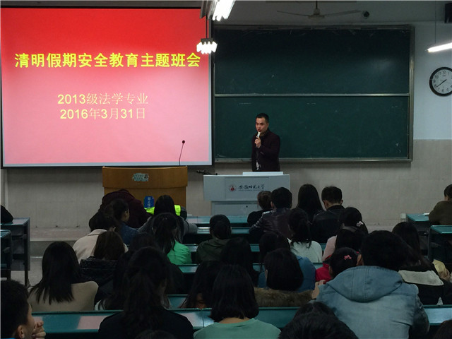 3月31日晚四点半,2013级法学专业在教室2020104召开清明假期安全教育主题班会。本次班会由2013级法学专业辅导员陈兴宇主持,13级全体学生到场参加了此次班会。