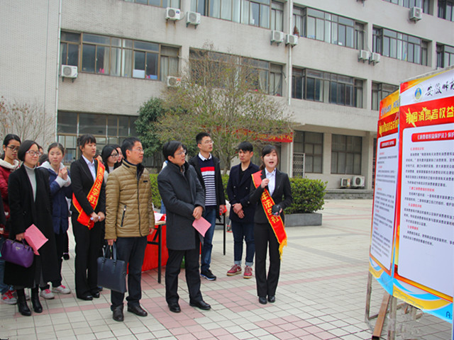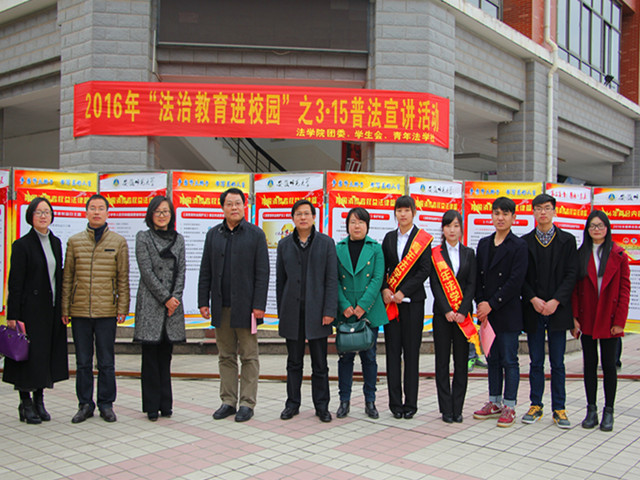 为深入落实“依法治国”理念,实行依法治校、依法执教,实行“法治进校园”,增强学生安全和法律意识,营造文明,平安,和谐的校园育人环境,借“3·15”为契机,深入宣传消费者权益保障知识,bet36365路检测中心团委、学生会联合青年法学社于3月15日11:00在二食堂门口举办了一场以“法治教育进校园”为主题的普法宣讲活动。校党委副书记李琳琦、校学工部部长、学工处处长台启权、校团委书记梁燕、bet36365路检测中心党委副书记屈光峰、团委书记王虹圆、13兼15级行政管理辅导员瞿津津和青法社指导老师李路根莅临现场,参与活动。