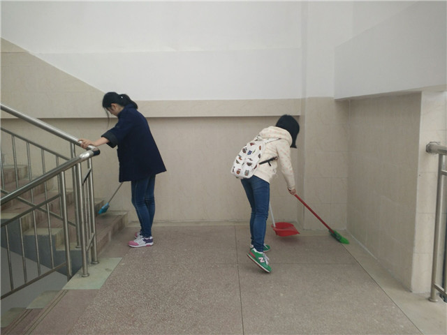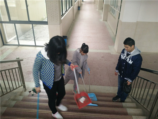 活动伊始,15卓司团支书吴佳佳首先进行任务分配,同学们一共分成四个团小组,分别打扫教学楼楼梯、教室卫生、擦玻璃和摆放自行车。活动正式开始后,第一团小组成员拿出了自己从寝室带的扫帚和垃圾袋,打扫教学楼楼梯和走廊卫生;第二、四团小组进入空教室,清扫空教室垃圾,并拿抹布擦窗户和桌子;第三团小组将原本凌乱的自行车摆放整齐,并将散落的垃圾清理干净。每个团小组成员都认真完成分配的任务,使原本拥挤的教学楼和走廊变得整洁有序,为来往行走的师生们带来了方便。