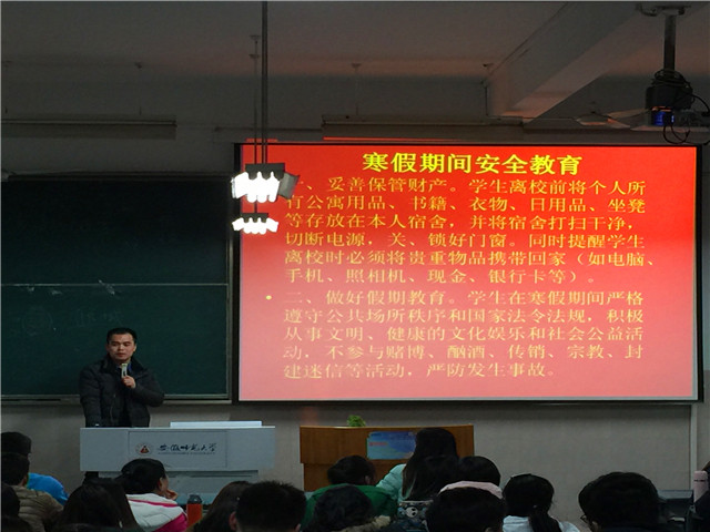 12月30日下午四点半,2013级法学专业在教室2020303召开寒假期间安全教育主题班会。本次班会由13级法学专业辅导员陈兴宇主持,13级全体同学到场参加了本次班会。