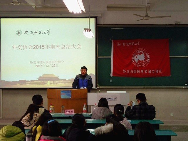 为总结社团学期工作成果,发现问题,查找不足,为下学期社团工作开创新局面,12月23日中午12点10分,外交协会在行知楼2020304教室召开2015年期末总结大会。社团指导老师李路根老师、社团会长周小凡同学,副会长钱立刚同学、王顺同学,以及社团主席团助理、社团顾问委员会成员、各部门部长、副部长和全体理事共计七十余人参加了大会,大会由副会长王顺同学主持。