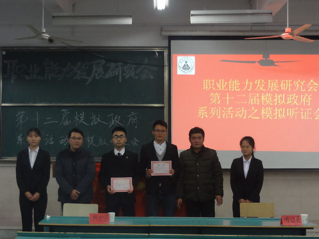 11月26晚七点,职业能力发展研究会第十二届模拟政府系列活动之模拟听证会在热烈的掌声中拉开了帷幕。此次活动邀请了职研会指导老师陈鹏和王焕炎,职研会会长郑俊、青年法学社代表王玉峰、外交协会代表邱浩等也到场参加活动。