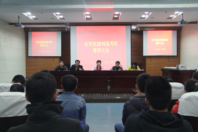 在考研即将进入最后一个月倒计时之际,为把关心和鼓励考研学生的工作落到实处,帮助他们进一步坚定考研的决心,以良好的精神面貌迎接即将到来的全国研究生入学考试,11月16日下午,bet36365路检测中心在模拟法庭召开了2016年考研誓师大会。bet36365路检测中心院长彭凤莲,党委副书记屈光峰,副院长周俊强、12级行管辅导员严宏和12级法学辅导员胡桂芳出席了本次会议。会议由周俊强主持。