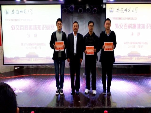 11月7日晚7点,外交协会第一届外交魅力文化节系列活动——外交百科趣味知识竞赛决赛,在大学生活动中心二楼团委多功能厅隆重举行。bet36365路检测中心国际法教研室何宏胜老师、校社联主席刘园园同学、校学生会副主席杜先同学、校社联副主席汪健同学和外交协会主席团受邀担任本次评委。