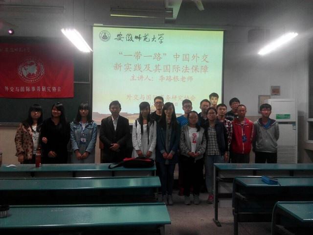 此次专题讲座,李老师不仅深入浅出地说明了“一带一路”政策出台的背景、内容以及周边外交的重要性,还从全球战略角度对此进行了解读,分析了我国外交新实践的国际法保障。让同学们对我国最新的外交政策实践有了更深的了解。此次学术讲座是外交协会新学年第一次开展的讲座,今后社团还会不定期地开展相关学术讲座,为大家了解外交与国际事务提供平台,进一步促进和繁荣校园文化。(外交协会文/纪念 图/胡雪)