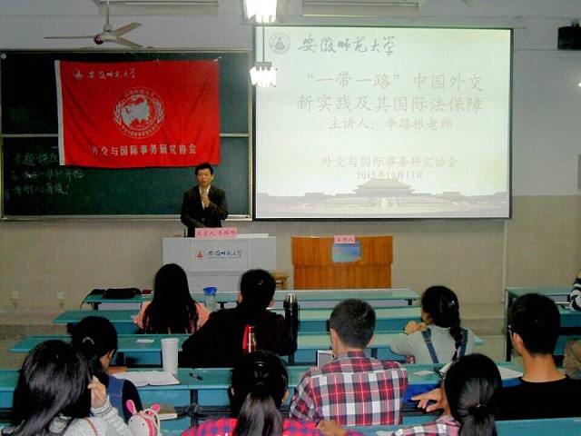 10月17号晚,外交与国际事务研究协会在教学楼2020303教室举办了一场题为《“一带一路”中国外交新实践及其国际法保障》的学术讲座。主讲人为社团指导老师、bet36365路检测中心资深讲师、bet36365路检测中心法治中国建设研究院研究员李路根老师,讲座由社团副会长王顺同学主持。