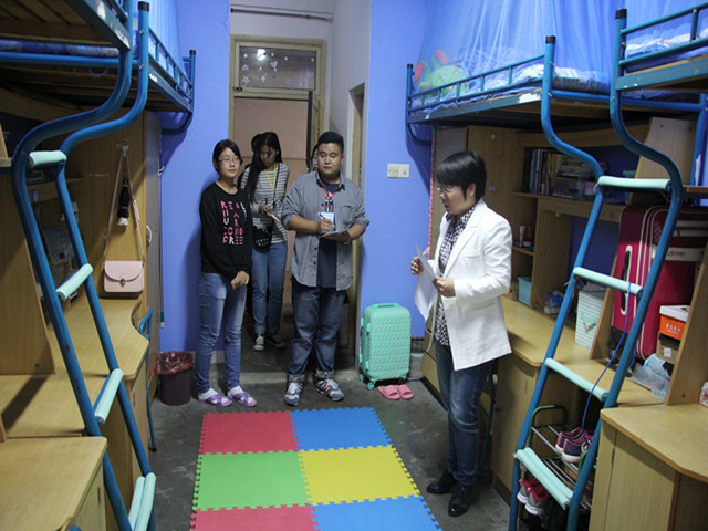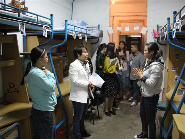 下午4点,评比正式开始。评委们就各寝室的寝室文化、创意设计、卫生清洁、物品摆放、解说介绍及态度这些方面进行评分。各参选寝室的主讲人热情欢迎评委们的到来,并详尽细致地介绍了精心装扮的寝室。精美的舍徽、充满个性的寝室名、温馨的墙纸,无不极具创意,夺人眼球。另外,手工制作的宣传栏、千纸鹤、门帘等,也体现了节俭、环保、美观的原则,充满浓厚的文化氛围。一路上气氛欢快,寝室内惊喜连连,老师及评委们不仅对同学们的热情表示鼓励和赞赏,也对部分寝室的不足之处提出了意见和建议,同时,老师们也强调了寝室的安全问题,要求同学们注意安全,及时更换损坏的硬件设施。亲切和蔼的态度和风趣幽默的语言,增进了老师和同学之间的感情,也有利于同学们再接再厉,更加努力地打造良好的寝室文化氛围。