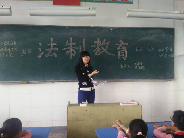 中学组方面,在负责人董丽军的带领下,普法小组成员首先与石硊中学的主任俞主任及本次普法一班的班主任朱老师就本学年普法工作进行了简短的交流。之后,第一次普法活动正式开始。首先每位小组的成员都上台作了简短的自我介绍,接着由王园园讲解团队的发展和普法准备工作,她详细展示了团队普法活动的长时间准备工作和严谨的总结流程,希望同学们珍惜普法活动的机会,多学知识。紧跟着是王璐璐向大家解释“灋”的含义,她也向大家简单的说明法律的作用。最后董丽军用案例的形式向大家表明了未成年人保护法的重要性,简单却令人印象深刻。