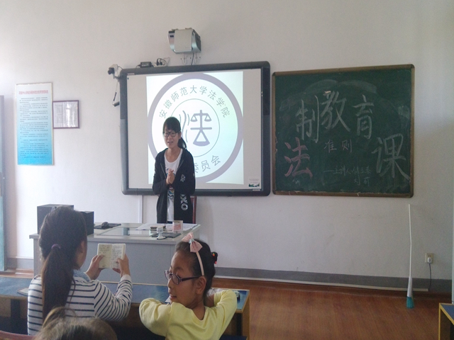 另一方面,在多媒体教室,主讲人储玉泰向学生们提问关于对法的映象,大家各抒己见后,她在同学们的多样回答中引出本次主题“法律”。紧接着她用“说说你眼中法律的脸”为题,启发同学们对于法律特点的生动认识。她用“法律与班规的区别”等问题激起了同学们学习的兴趣,同学们更加认真的聆听并且积极地参与到课堂互动中来。随后刘莉向大家宣讲了《未成年人保护法》的相关内容,并详细的指出保护法在同学们生活中的意义所在,以及同学们享有的作为未成年人的权利;接着她用一张漫画,通过向学生们讲解漫画的内容,引出肖像权这个概念;她从学生身边小事说起,结合PPT上的漫画,生动的讲解与漫画内容有关的权利,从而加深同学们对相关权利的理解;紧接着在刘莉与学生们答疑的互动环节中,同学们踊跃的回答令课堂气氛走向高潮。