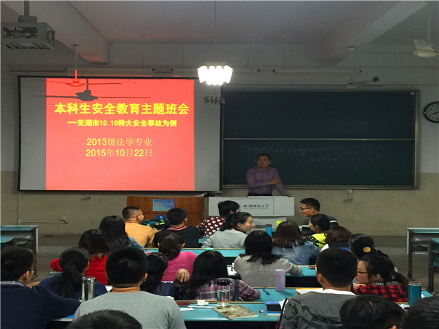 10月22日晚上八点半,2013级法学专业在教室2020304召开本科生安全教育主题班会。本次班会由13法学辅导员陈兴宇主持,13法学全体同学到场聆听。
