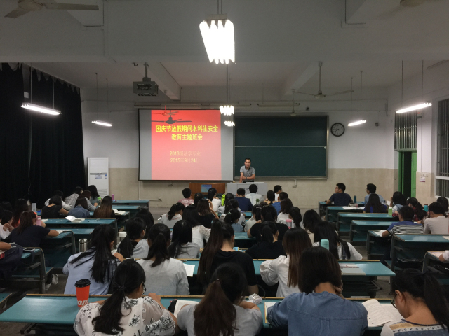 秋高气爽,金桂飘香。为做好国庆长假期间本科生的安全工作,保障学生的人身安全与财物安全,9月24日晚7点半,在辅导员陈兴宇老师的主持下,13法学2班全体同学于行知楼2010306教室内召开安全教育主题班会。