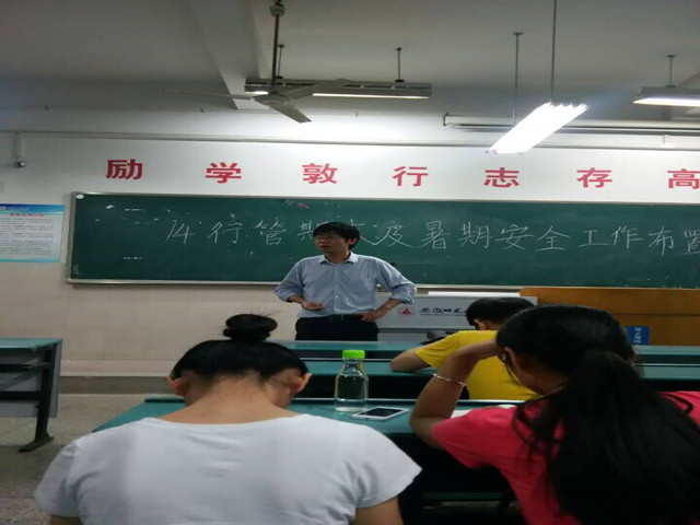 2015年6月27日晚上七点整,全体14级行政管理专业的学生在花津校区2020404教室展开了一次以“期末暨暑期安全布置”为主题的班会。
