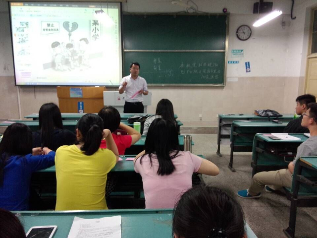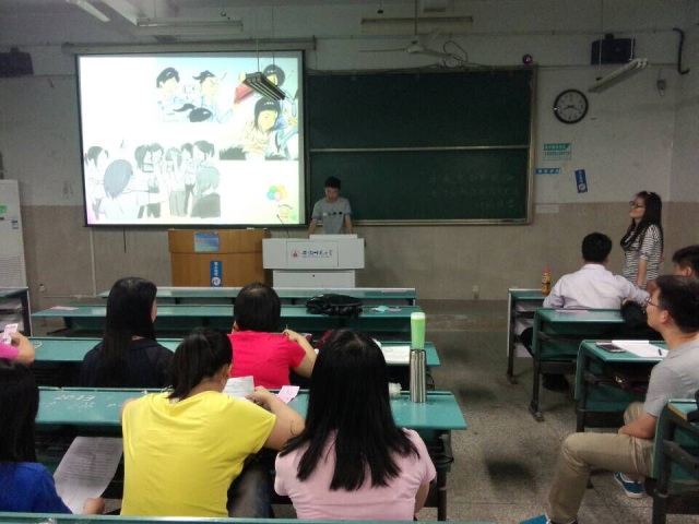 培训分为课堂普法预演和教学内容、方法指导两部分。首先由中学组王璐璐、欧阳惠和左丽丽率先预演,围绕“校园暴力”主题,三人依据问题剖析、漫画展示、游戏互动的思路,将普法全过程完整展示。接着,小学组宋琴、储玉泰、赵露雅和邓瑞采用普法同样思路,继续以《未成年人保护法》为主线,把相关未成年人具体权力和义务做了详细的阐释。