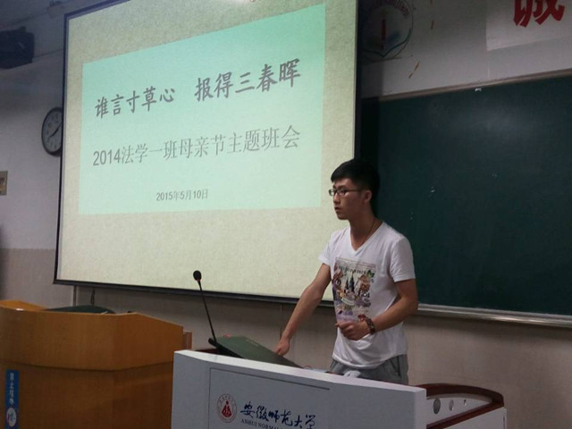 为了响应一年一度的母亲节,同时为了提高全班同学的感恩意识,5月10日晚14级法学一班组织以感恩母亲主题的班会,由法学一班班长杜冠辰主持,14法学一班部分同学参与。
