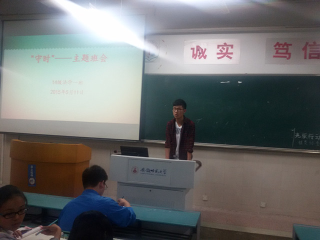 少年易学老难成,一寸光阴不可轻。为了加强全班同学的守时意识,同时也为了加强班级学风建设,5月10日晚,14级法学一班开展“守时”的主题班会,由法学一班班长杜冠辰主持。
