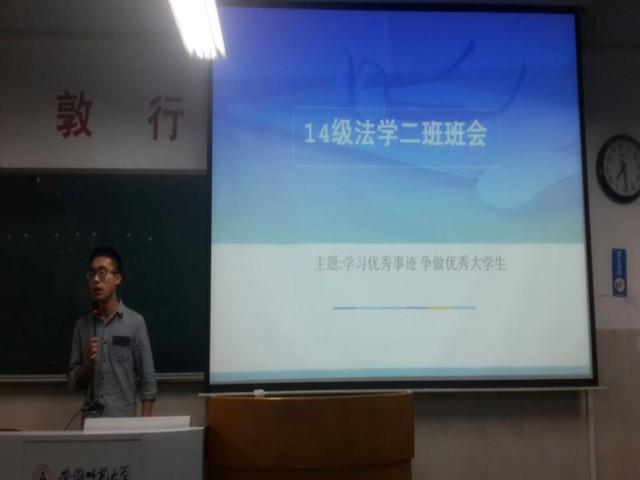 2015年5月12号晚7点在2020404教室,14级法学二班“学习优秀事迹、争做优秀大学生”主题班会在全班同学的热烈掌声中圆满的落下了帷幕。本次班会由班长万飞翔主持,全体二班同学共同参与。
