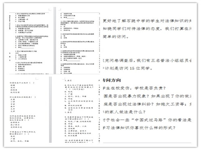 白马街道普法小组中学组和小学组同学在经过前期多次的开会讨论、对问卷的不断修改、对调研方案的不断完善之后,整理出较为完善的调研方案。中小学教师调研负责人谭文慧、小学学生调查问卷负责人王亚男等几位同学先进行了简短的自我介绍并将准备好的方案发给中小学校长,俞校长和杨校长在仔细阅读后对同学们的努力表示肯定和感谢,并表示将最快给我们反馈信息,据悉,5月5日将会开展第一次白马街道实地调研。