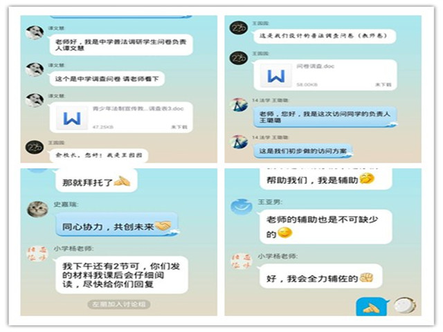 继17日、24日两次的座谈会交流学习之后,4月29日下午,bet36365官网白马街道普法调研工作正式开展。在采纳了白马街道司法所吴所长的建议后,为了最大化的节约时间和提高效率,这次普法实践交流改为线上交流。4月29日下午两点半与石跪中学俞校长和石跪小学杨校长在网上进行了细致的方案磋商。