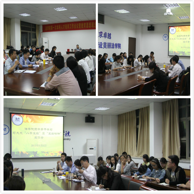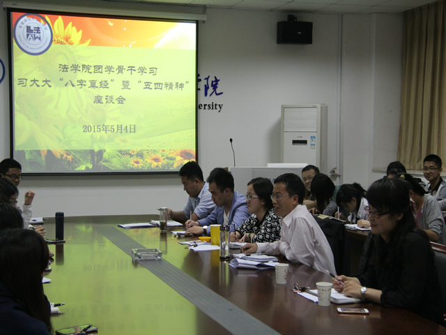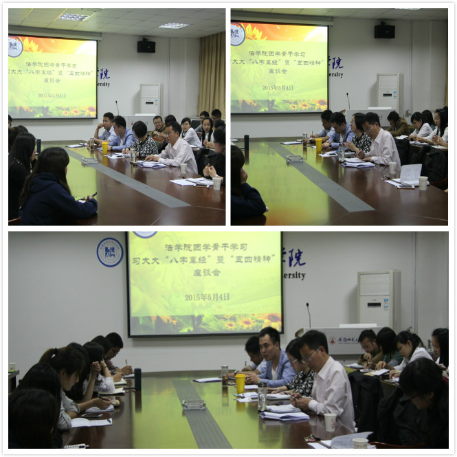 5月4日晚7:00,在行政楼四楼会议室,bet36365官网召开主题为“学习习近平‘八字真经’暨‘五四’精神”的团学骨干座谈会,bet36365路检测中心党委副书记屈光峰、12级法学辅导员胡桂芳、13级行政管理辅导员瞿津津、13级法学辅导员陈兴宇、14级法学辅导员王琳和本科生团支部干部参加了此次座谈会。座谈会由王琳主持。