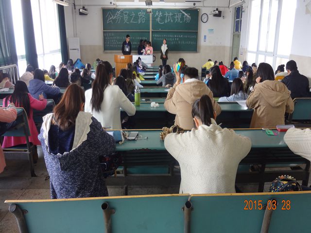 “公务员之路”系列活动是职研会的招牌活动之一,受到了同学们的认可,参与度也在逐渐提升。这次笔试分三个批次共13个考场进行,笔试内容为公务员考试模拟题。在郑俊副会长安排与带领下全体部长和理事进行了细致而高效的组织、监督与试卷审阅工作,参赛者也认真地对待了这次笔试,细心作答,诚信考试,考场气氛严肃而紧张。这不仅是一场考试,活动在参与人数与答卷质量上都收到了令人满意的效果