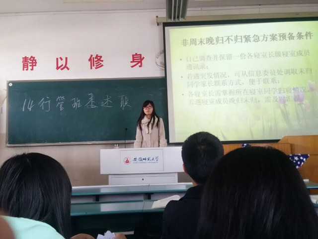 时光如驹,匆匆而过。2015年4月8号,2014级行政管理专业的学生在2020504教室召开了班委述职大会。本次会议由辅导员郭敬东主持。