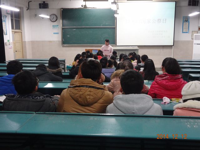 12月12日晚上7点半,职研会和青法社两大社团的各部部长、理事在2020303教室集合,职研会副会长郑俊主持了此次活动。活动开始之初,郑俊首先发表演说。她对国家公祭日的来历、南京大屠杀死难者国家公祭日的设立决议和设立意义都做了详细的介绍。其中,郑俊重点谈到了设立国家公祭日、举行公家公祭仪式对内对外的意义:第一,沉重打击日本右翼试图歪曲、抹杀历史的“翻案“企图;第二,彰显对生命的敬畏、对人权的尊重;第三,牢记战争悲剧,追求共同和平;第四,反思历史教训,激昂民族精神。