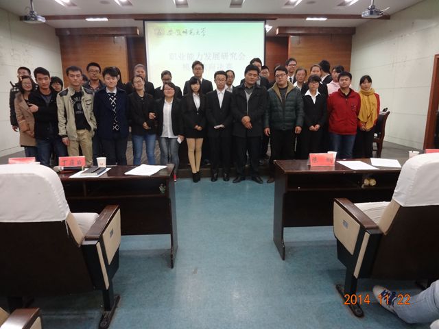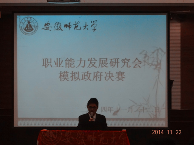 2014年11月22日19:30至21:00,职业能力发展研究会在模拟法庭举办了模拟政府活动的决赛,参与本次活动的有职研会的指导老师陈鹏老师和王焕炎老师、数学建模协会负责人左芸芸、爱心者协会负责人陈琛、德育研究会负责人冯裕国、青年法学社负责人丁庭威、校社团联合会的评鉴组以及四组参赛选手、职研会的工作人员和参赛选手的亲友团。
