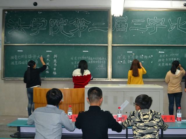 经过一轮海选,共选出近百名字迹工整的优秀学子。决赛时选手分为两部分进行比赛,一部分选手以《幸福》为题写硬笔字,另一部分则在黑板上书写“挥毫书写幸福师大,泼墨描绘青春华章”的字句。所有选手在硬笔字、粉笔字书写完后开始写毛笔字。选手们的硬笔字苍劲有力,显示出力与美的结合;粉笔字洋洋洒洒,个性十足;毛笔字行云流水,笔墨飘香,整场比赛有条不紊的进行着。赛时选手们努力发挥自己的实力,赛后评委们本着公正平等的原则进行评分。