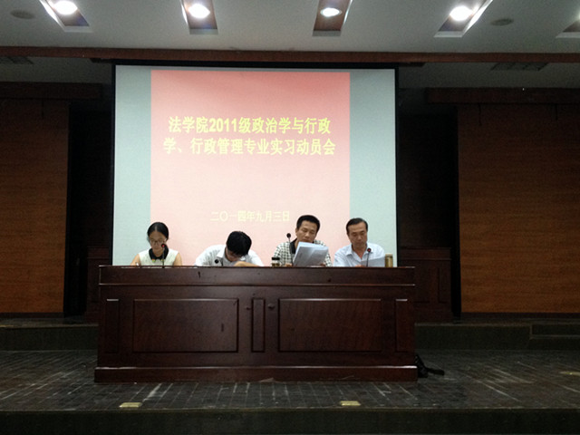 9月3日下午,2011级政治学与行政学、行政管理专业召开实习动员大会。教学副院长严宏、科研副院长周俊强、公共管理系主任周仁标老师、辅导员瞿津津以及全体实习指导教师出席此次动员大会。
