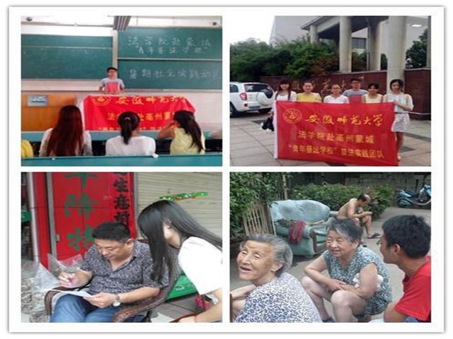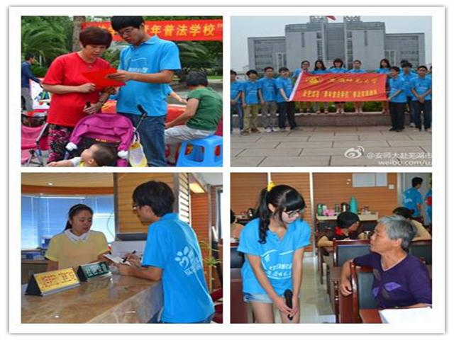 在负责人江山的带领下,大家走进芜湖居民社区和街道办事处,为社区群众和孩子普及《消费者权益保护法》、《环境资源保护法》、《未成年人保护法》等相关法律法规,帮助大家增强法律意识,学会拿起法律武器来维护自己的合法权益,同时也有利于团队成员们关注时政,了解法律,推动我国法制建设。