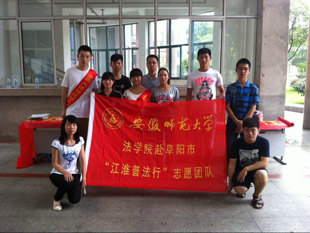 芜湖总队和安庆分队着重以新《消费者权益保护法》为重点。活动大致可分为“发放传单、有奖竞答、答疑解惑”三个部分。在征得小区管理员同意后,一部分队员在小区广场设立服务站点宣传法律常识,另一部分队员则每人持法律宣传手册和传单,对来往的市民进行发放并提问日常法律常识。群众积极回答问题,正确率较高,显示群众的法律素养有所提高。最后,队员们在宣传台上解答群众提出的简单的法律问题。群众对于此环节更热心,纷纷提出问题。队员们根据群众的提问热心解答,对于能解答的问题当场予以解答,对于不能解答的问题,队员们留下了自己的联系方式,准备在询问老师或者查阅有关资料后做出解答。阜阳分队着重宣讲《劳动合同法》和《婚姻法》,通过多点宣传的形式,通过向过往的学生赠送由社团自制的普法宣传册,分发阜阳市中级人民法院期刊,悬挂十大法治人物和十大法制事件的写真,法律知识有奖问答,万人签名等系列活动。面向全校教职工、周边居民解决法律纠纷。同时,我社还设立了咨询点,为大家答疑解惑,以期望能够切实地帮助到那些需要法律援助的人。