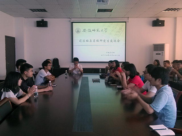 6月28日下午4点,bet36365路检测中心行政楼会议室,刚刚结束本科生毕业典礼的毕业生,潘雪松、翟晓强、程健、蒋超和曹若愚等五位毕业生与13级司法实验班的同学举行交流会。他们考取了华东政法大学、苏州大学、南京师范大学、安徽大学等我国知名bet36365路检测中心校的研究生。交流会由实验班辅导员陈银珠老师主持。