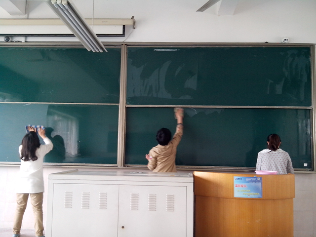 活动中各部门部长认真积极指导理事的工作,并亲自参加了对黑板课桌的清洗。部长理事认真仔细地对教室黑板课桌的每一个角落进行清理,为教师们上课提供了一个干净舒适的教育环境,也为同学们提供了一个更加适宜的学习环境。