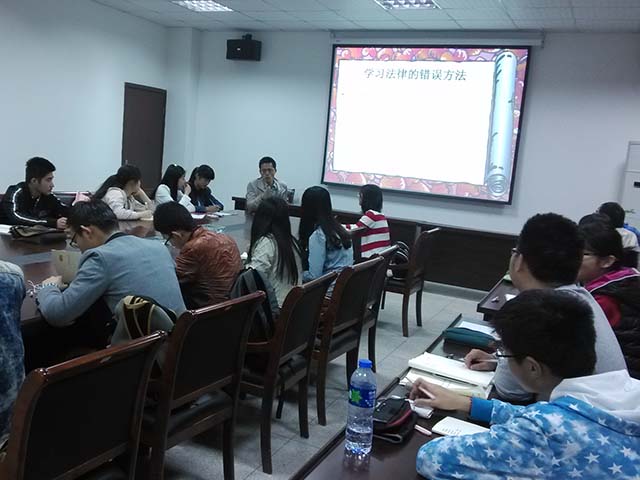 活动伊始,汤瑞同学作了开场白,并介绍了本次活动的程序。此次活动按照老师主讲,4名学生点评、其他学生提问、老师回应的程序进行。随后,陈老师开始主讲。陈老师围绕学习法律的目的、学习法律的错误方法、学习法律的正确方法、学习法律的个人条件等四个方面进行说明。他认为,学习法律的目的在于对案件判决的预测;学生在学习法律过程中,存在死记硬背、钻牛角尖、依赖考试用书、陷入纷繁复杂的学说的迷雾等错误方法;学习法律要掌握各门法律的理论体系,通过搜集案例来理解法律,多与老师同学交流等;学好法律需要兴趣、本人的天分和全身心的投入。接着王玥、王方圆、汪盈怡、杜浩鹏等四位同学针对陈老师主讲的内容,提出一些质疑和问题,包括怎样搜集案例、法律与其他学科之间的关系、学习法律与从事非法律职业之间的关系、如何分配众多法律学科之间的时间精力等。最后,陈老师对四名同学和其他同学的提问作了回应。