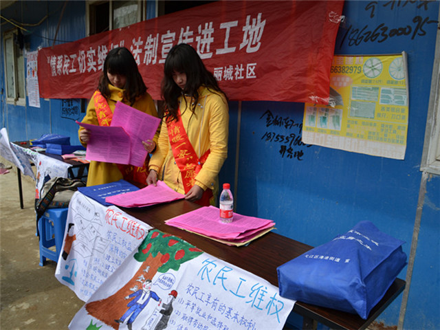 为促进bet36365路检测中心社区“法律服务站”志愿服务的常态化、专业化,3月13日中午,bet36365路检测中心青年志愿者们来到了位于丽城社区的亚坤公司工地,开展“情系民工,切实维权”法制宣传活动。