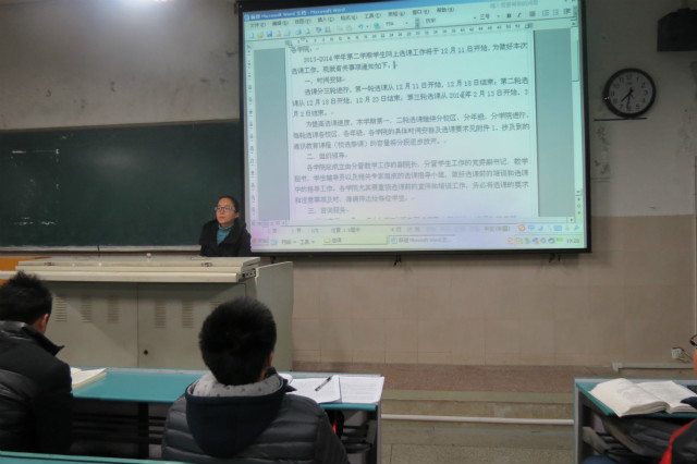瞿津津对我校选课系统操作做了详细的介绍,通过PPT展示了选课具体操作步骤,对本学期需进行的选课程以及选课时间做出了通知。并对公共课、校选课、院选课等概念作出了通俗易懂的解释。她最后叮嘱同学们尽快熟悉选课系统操作,切勿错过选课时间。