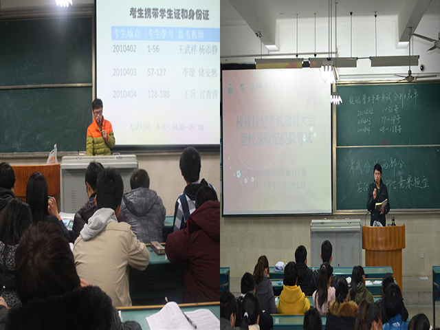 在活动正式开始之前,两个班的班长首先向大家宣布了学校和学院组织校规校纪考试的注意事项、考试时间、考场安排及本次活动的具体安排。活动主要分为以下两个方面:首先采用闭卷考试的方式来考察同学们对校纪校规的掌握情况,时间为50分钟;之后采用有奖竞答的方式来测试同学们对校纪校规的运用情况。同学们热情高涨,积极有序地参与本次活动。