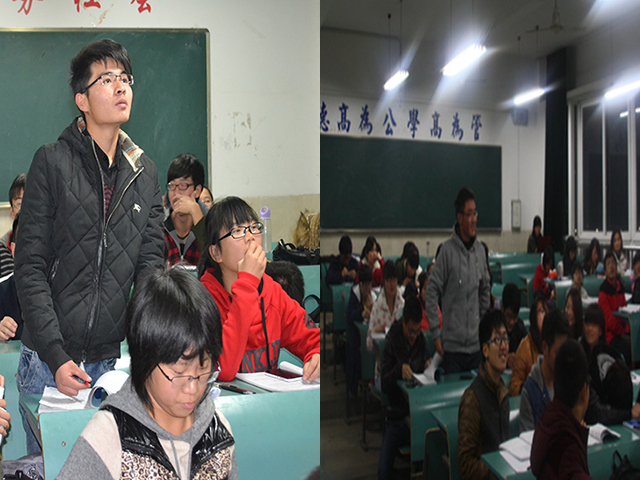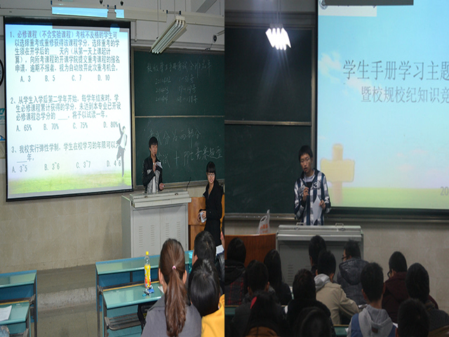 为加强班级管理、维护同学们正常的学习生活秩序、营造一个更好的学习与生活的校园环境。2013年11月27日晚,2013级法学1班、2班分别在教室2010401、2010402举行校纪校规模拟考试、校规校纪学习知识竞赛,两班学习委员分别担任知识竞赛的主持人和模拟考试的监考老师。